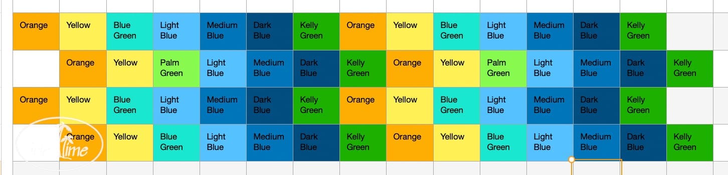 Step Three: Cut strips perpendicular to your seam lines in the same width as you cut the initial strips (mine were 5″). You will now have strips of colored squares. Set them out on a flat surface and adjust the strips as you initially planned so that the same colors do not line up. You can shift alternating strips or flip them around to play with how the colors line up.